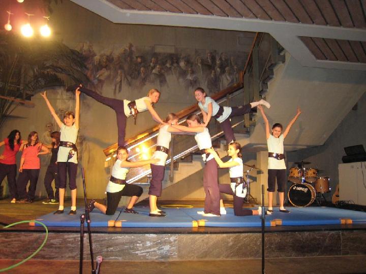 Einen weiteren, heiteren Abstecher in die Karibik unternahm die Instrumental-AG mit Frau Smeeth. Ihre Instrumentalstücke, wohlbekannt durch Harry Belafontes Lieder und musikalisch sehr ansprechend in Szene gesetzt, ließen besonders bei den älteren Zuhörern Erinnerungen aufkommen. Anschließend beeindruckten 30 Jugendliche der Klasse 8a mit ihrem exakten, gefühlvollen Glockenspiel und dem Stück „Für Elise – keine Nacht“. Sie erhielten viel Applaus! Schwungvoll präsentierte sich eine Mädchengruppe der Klassen 9 und bot mit ihrer „Schwarz-Weiß-Komposition“ in einer modernen Tanzinterpretation, Choreografie Frau Meyer, ein ganz besonderes visuelles Erlebnis. Frau Ehret und die Akrobatik-AG der Unterstufe zeigten Akrobatik voll Schwung, Rhythmik, Dynamik und Beweglichkeit, was die Zuschauer mit starkem Zwischenapplaus honorierten. Eine Großleinwand und szenische Darbietungen in Englisch gaben einen Einblick in den Englischunterricht der Klasse 8c mit Frau Eder. Mit selbst verfassten Texten versetzten sie Jung und Alt gekonnt in die Filmszene nach Hollywood. Nach dem herzlichen Dank von Schulleiter Gerd Fischer für diesen ganz besonderen Abend an alle Mitwirkenden und die AG „Licht und Ton“ brachte die Schulband die Zuhörer so richtig in Stimmung. Die Band mit ihren fünf „Front-Sängerinnen“ überzeugte mit ihrem eigenen Musikstil und ließ den Abend froh ausklingen.