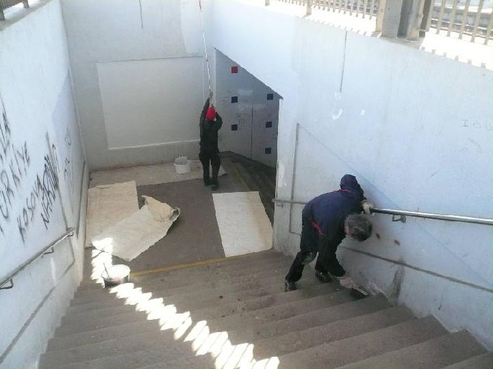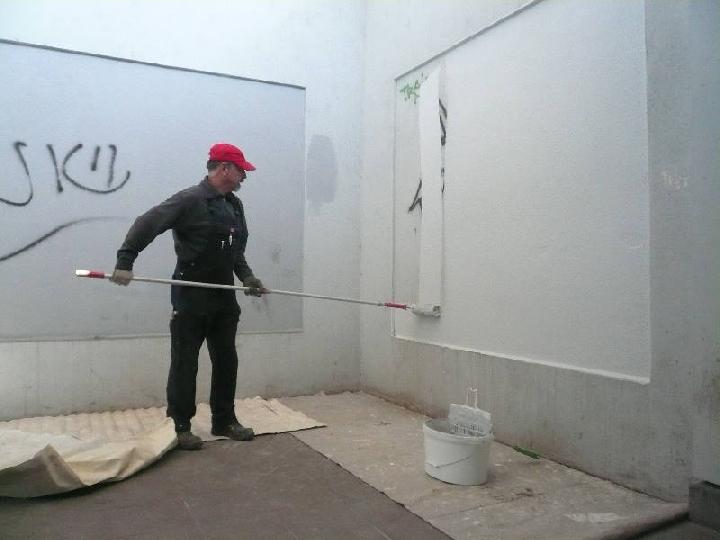 Nichtsahnend im Bahnhofsbereich unterwegs fallen plötzlich Farbeimer mit weißer Farbe ins Auge und - es ist kaum zu glauben - die Fussgängerüberführung strahlt bereits in reinstem Weiß! \"Eigentlich nur gegen eine Gage\"..... |