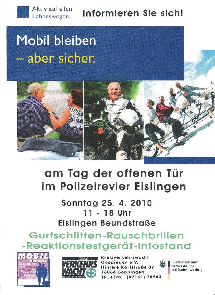 Am verkaufsoffenen Sonntag 25. April 2010 veranstaltet das Polizeirevier Eislingen einen Tag der offenen Tür im neuen Reviergebäude an der Ulmer Straße. An diesem Tag kann die Bevölkerung von Eislingen hinter die Kulissen des neuen Wirkungsgebäudes ihrer Polizei schauen.