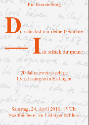 Nun wird, gefördert vom Kulturamt, in der eislinger edition des Kunstvereins ein Band erscheinen, der all das dokumentiert: Ausgewählte zweisprachige Gedichte, ein Essay von Tina Stroheker über das Projekt, Stimmen der PartnerInnen und eine Auflistung aller Abende geben Einblick in ein ziemlich einmaliges literarisches Projekt.