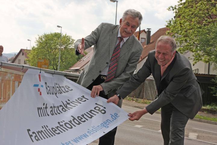 Offensiver als bisher bewirbt die Stadt Eislingen seit dieser Woche ihre Bauplätze. Zum Start der Kampagne, in deren Verlauf auch der Relaunch der Bauplatzbörse im Internet (www.eislingen.de) vorgesehen ist, wurden am Montag vier Banner an für den Durchgangsverkehr markanten Stellen aufgehängt. Sie weisen insbesondere auch auf die Förderung für junge Familien hin. Die Familienförderung sieht vor, daß Familien mit bis zu vier Kindern unter 18 Jahren beim Erwerb eines Grundstücks einen Preisabschlag in Höhe von 4.000 Euro pro Kind erhalten.
