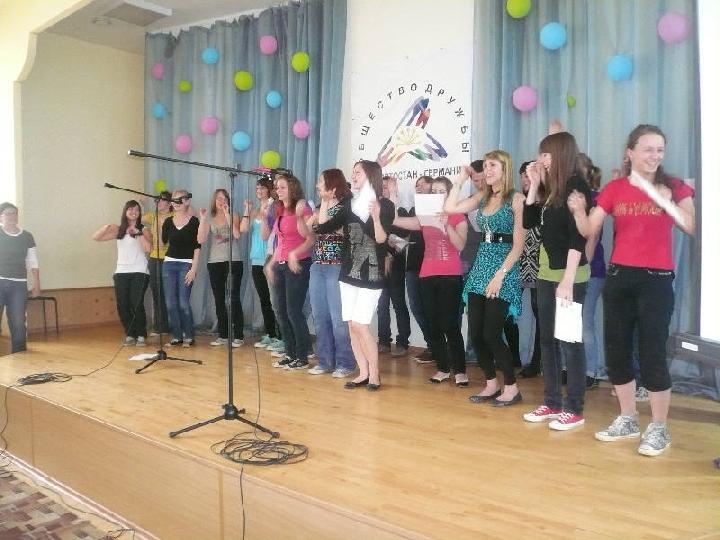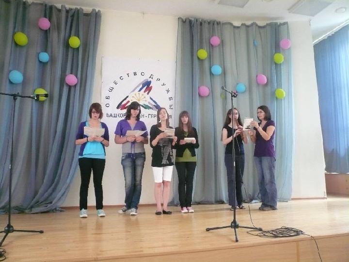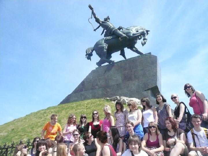 Zehn Tage bei hochsommerlichen Temperaturen in Russland unterwegs, Zwischenstopp in Vnukovo, mehrere Tage am Gymnasium No 86 in Ufa, Baschkortostan, auf Ausflug in den Südural und schließlich zwei Tage in Moskau: die 21 Mädchen und Christoph haben viele neue Freundschaften geschlossen, viel gesehen und erlebt. Deutsch und Englisch lernen in Russland, interessante gemeinsame Stunden, der Lehrer dominierender, Lehrer = meist Lehrerin. Kulturprogramm auf Deutsch, zusammen mit zwei anderen Schulen mit Deutschprofil, von kleinen Sketchen der Sprachanfänger bis zu beinahe professionellen Auftritten der AbschlussschülerInnen, baschkortische Tänze und Gesänge ebenso wie der Chor mit deutschen Volksliedern. Das EKG Team hielt dagegen mit 'Auf de schwäbische Eisabahne', gefühlvoll gesungenem Matthias Claudius, 'Der Mond ist aufgegangen' und aktuelleren Liedern.Eine Powerpointpräsentation von Deutschland bis Eislingen und ein pfiffiger Quiz erfreuten die russischen Gastgeber. Bei Salawat Julajew, dem Nationalhelden Baschkortostans, Malojas, Rajon Salawat |
