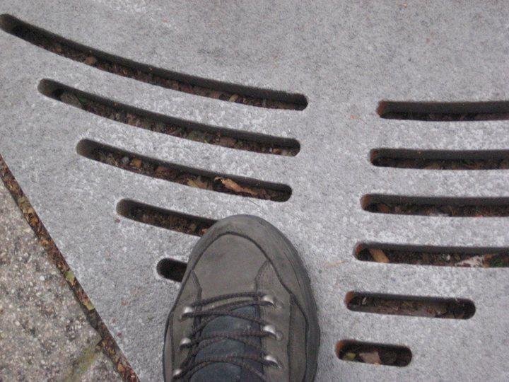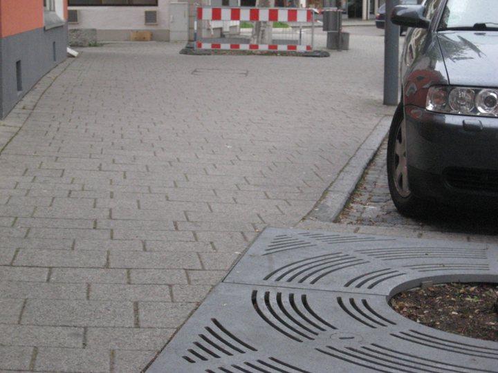 Ein Baum braucht Luft, Boden und Wasser um zu leben. Stadtbäume in der städtischen Umgebung machen da keine Ausnahme. Daher haben die Straßenbäume in Eislingen eine stählerne Fußmatte, die wasserdurchlässig ist und somit die Flüssigkeitsversorgung unserer Innenstadtbäume sicherstellen soll. Vorne die neue Oberfläche, hinten die Absperrung bis die Platten bearbeitet sind |