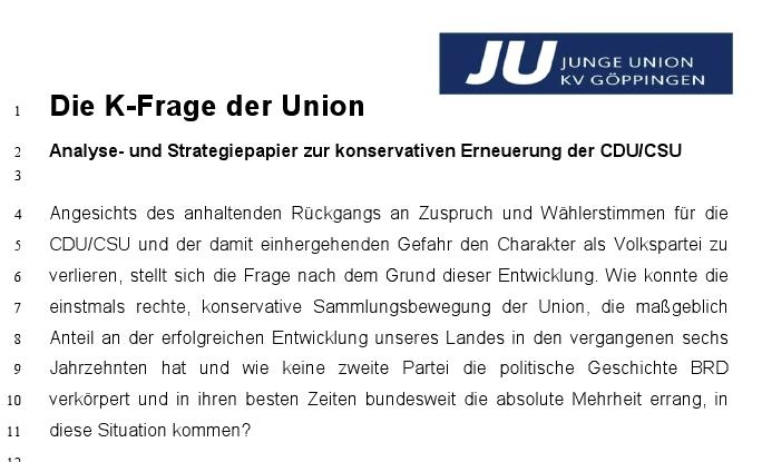 Die Junge Union, Kreisverband Göppingen hat das bundesweit für Schlagzeilen gesorgte Diskussionspapier zur konservativen Erneuerung der 'Merkel-CDU' zurückgezogen. Dieses war unter dem Namen 'Eislinger Erklärung' veröffentlicht. Mitverfasser dieser Erklärung war der CDU-Stadtverbandsvorsitzende Axel Raisch, der zugleich stellvertretender Vorsitzender der Jungen Union im Kreis Göppingen ist. |