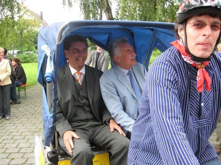 Nach dem Gottesdienst war der Tisch reichlich gedeckt sowohl mit einem vielseitigen Angebot für das leibliche Wohl, Bastelarbeiten der Kindergarten-Eltern als auch mit Angeboten jeglicher Art zur Erprobung der jeweils individuellen E-nergiereserven. Das Fahrradtaxi kam zum Einsatz bei der Abholung des neuen Stadtoberhaupts Klaus Heininger und des Bürgermeisters a.D. Günter Frank, die es sich beide nicht nehmen ließen, das Gemeindefest zu besuchen. Eskortiert von Pfarrer Dehlinger und Kirchengemeinderätin Ingrid Sing wurden sie nach einer Kreiselrundfahrt auf dem Kirchplatz herzlich begrüßt.