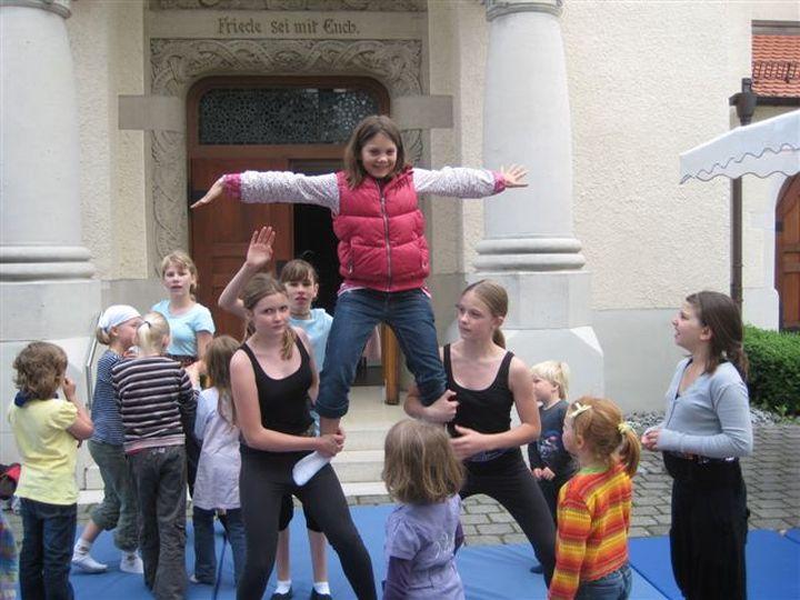 Das Unterhaltungsprogramm am Nachmittag wurde eingeleitet durch die Akrobatik-AG der Dr. Engel-Realschule unter Leitung von Frau Ehret. Die Schülerinnen präsentierten ein flottes, anspruchsvolles Akrobatik-Programm und luden im Anschluss alle Kinder zum Mitmachen ein, ein Angebot dem zahlreiche Kinder mit Begeisterung folgten.