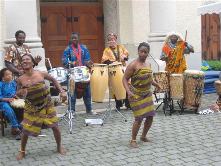 Ein besonderer Augen- und Ohrenschmaus bot sich zum Abschluss des offiziellen Programms mit dem Auftritt der Gruppe „Enyo Kelé“. Die Mitglieder der Gruppe stammen u. a. aus Togo und Ruanda und unterstützen mit ihren Auftritten auch kleinere Projekte in ihren Heimatländern. Mit ihren farbenfrohen Kostümen, den Tänzen, Trommelklängen und Liedern brachten sie eine ganz besondere Klangfarbe in den Nachmittag. Die Gäste ließen sich mitnehmen in einen für Europäer völlig ungewohnten, exotischen und ansteckenden Rhythmus.