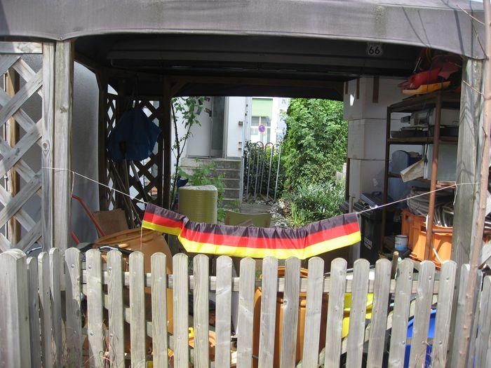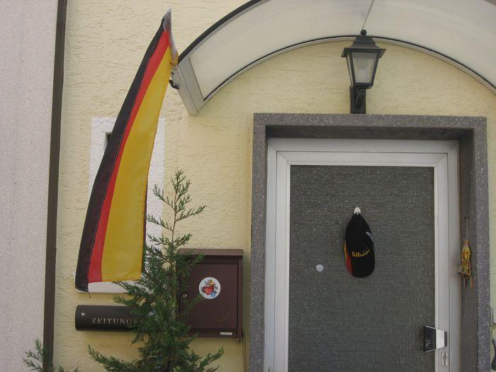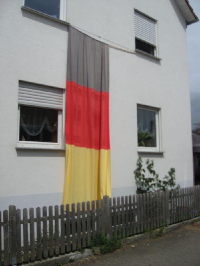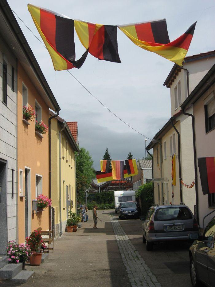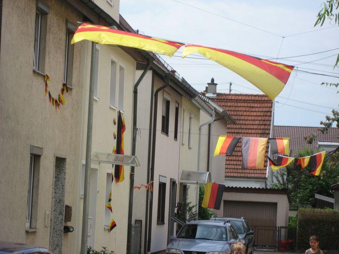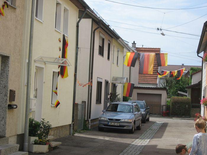 Biegt man von der Stuttgarter Straße nach Süden ab, landet man in der Seestraße. In diesem versteckten Gässchen wohnen die wohl größten Fans der erfolgreichen deutschen Mannschaft: Fahnen, Zeitungsausschnitte und Bilder von Spielern schmücken Häuser, Hecken und Gärten. Machen wir einen kleinen Spaziergang durch diese Fanmeile. in der Seestraße |