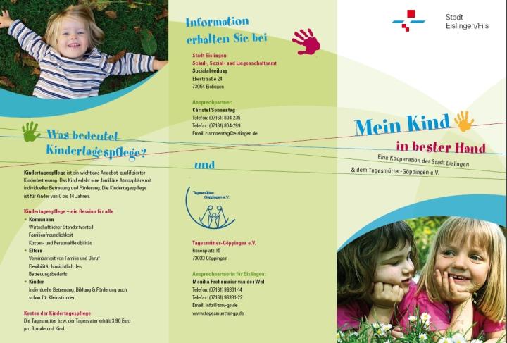 Über dieses Angebot in Kooperation mit dem Verein Tagesmütter Göppingen e.V. hat die Stadt Eislingen, Schul-, Sozial- und Liegenschaftsamt, Sozialabteilung eine Informationsbroschüre herausgegeben.