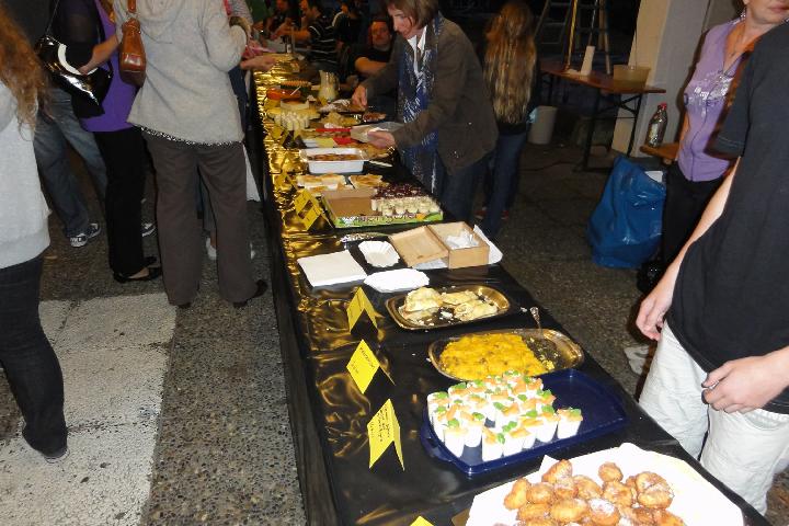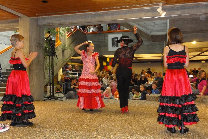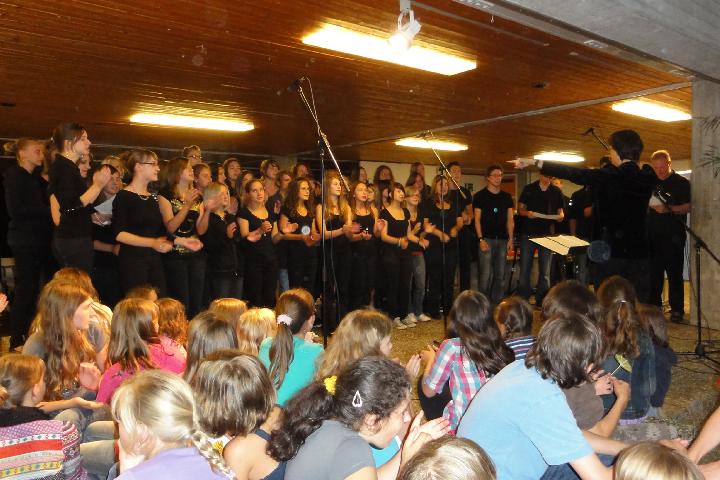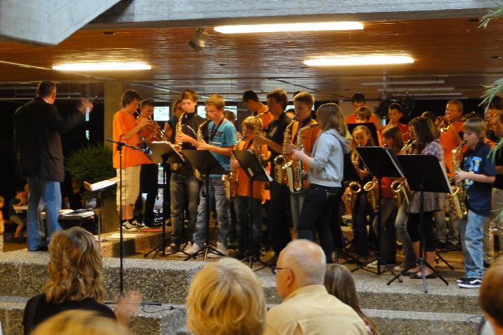 Rolf Straubinger, Sternekoch, ehemaliger Schüler am EKG und jetzt als Elternvertreter an seiner alten Schule engagiert, half mit seinem Team tatkräftig mit, das Schulfest zum Schuljahresschluss kulinarisch zu verfeinern, Asia-Spieße und Cevapcici im Fladenbrot ergänzten die traditionellen Roten Würste, Getränke aller Art wurden gezapft und entdeckelt, vor allem aber ein schmissiges Programm (siehe Fotos) lockte Eltern, Schüler und Lehrer unter das schützende Dach der Aula, da draußen ein heftiger Sommerregen niederging. Ehemalige und Jetzige nutzten die Gelegenheit zu intensiven Gesprächen, andere sorgten für den reibungslosen Ablauf. Die Big Band mit Dieter Läßle |