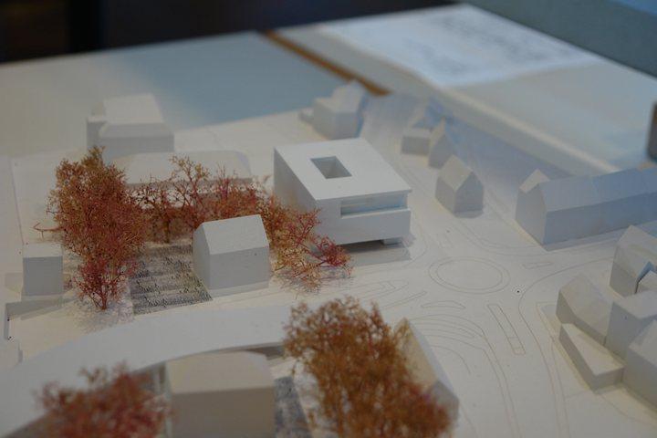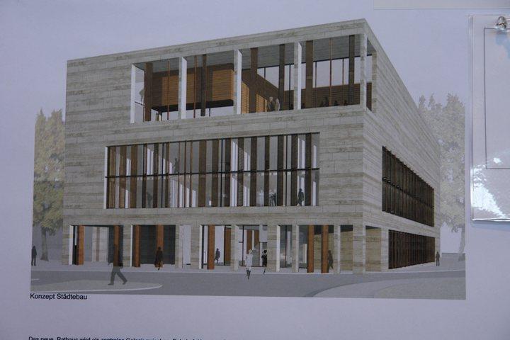 ..vom bisherigen Rathaus ausgesehen, stand den Mitgliedern des Preisgerichts der prämierte Entwurf des Frankfurter Architekten Ferdinand Heide zu weit links am Kreisel. Wenn das Gebäude weiter Richtung Westen aufgebaut wird entsteht der von der Jury angestrebte Platz vor dem neuen Rathaus.