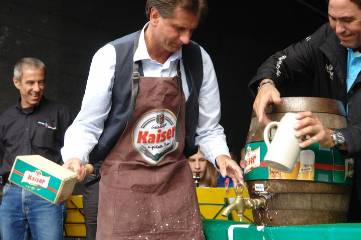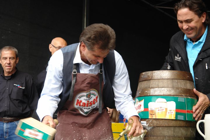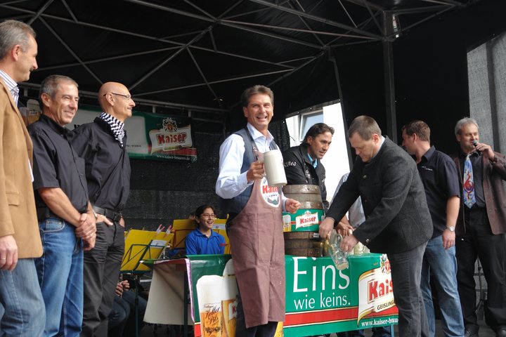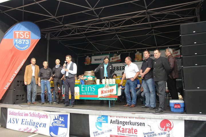 Bürgermeister Heininger hat die Feuertaufe mit Bravour bestanden und den Fassanstich mit zwei kräftigen Schlägen vollzogen. Musikalisch umrahmt wurde der Fassanstich vom TSG Musikzug.