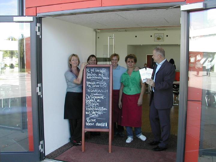 v.l.n.r. Kornelia Meinl (Mensaleiterin im Ösch), Mensa-Mütter Birgit Mühlich und Mechthild Sonntag, Annette Trevisani (hauptamtliche Mitarbeiterin) und der Erste Beigeordnete Herbert Fitterling bei der Präsentation der Info-Flyer für die Schulmensen