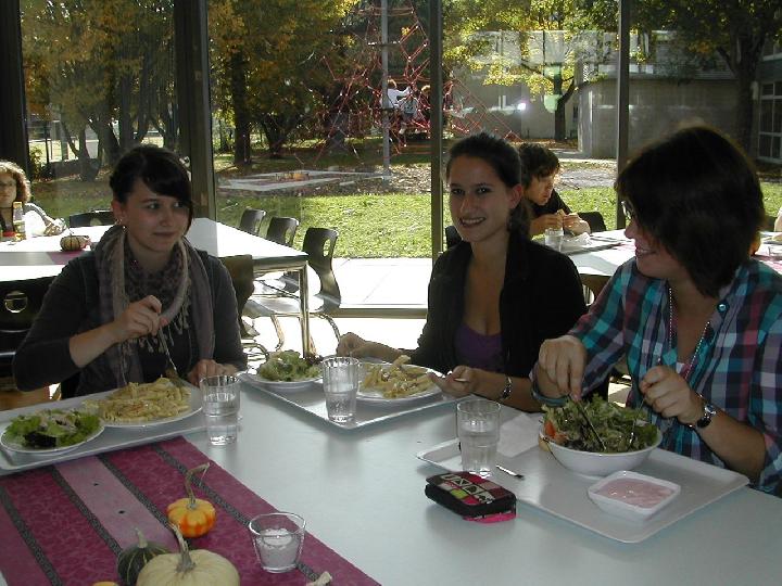 Seit Beginn des neuen Schuljahres gibt es vor allem in der Mensa im Ösch einige Neuerungen, die bei den Schülern schon nach kurzer Betriebszeit sehr gut angekommen sind. Bereits auf dem Weg zum Haupteingang weist ein Aufsteller handschriftlich in großen Buchstaben auf das aktuelle Tagesmenü hin. Cornelia Meinl, die neue Leiterin, weiß um die zentrale Bedeutung des täglichen Mittagstisches innerhalb der Schule. Gesunde Ernährung ist ihr und ihren haupt- und ehrenamtlichen Helferinnen genau so wichtig, wie eine gute Atmosphäre. Vor allem die „Mensa-Mütter“ um Mechthild Sonntag haben hier einen entscheidenden Anteil. Mit den herbstlich dekorierten Tischen soll die Mensa auch optisch ein Ort der sozialen Gemeinschaft sein, ein Platz, um vom Unterricht einfach mal abzuschalten.