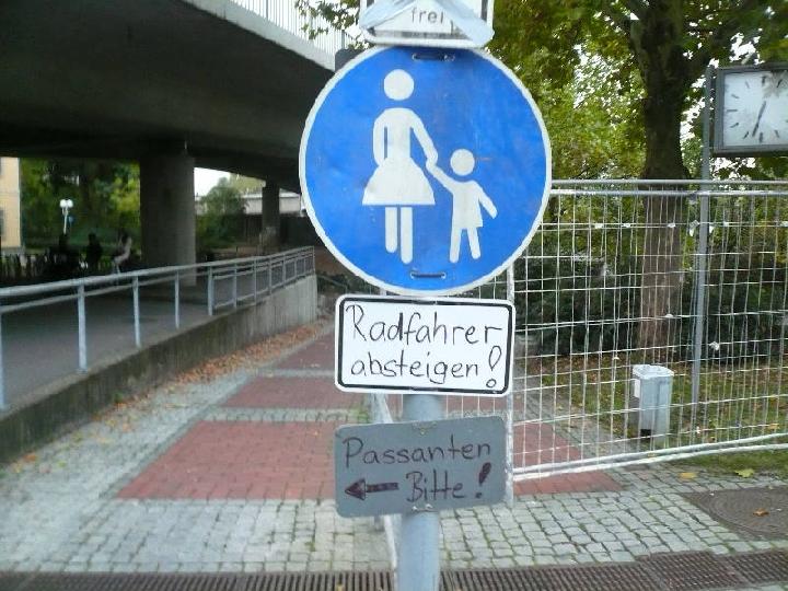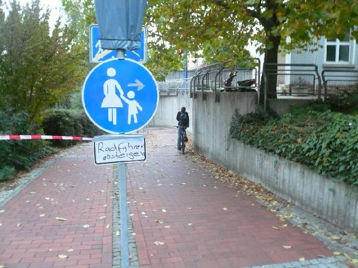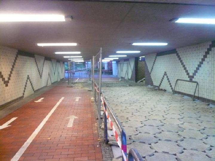 Nun ist es doch soweit: Die Bauarbeiten in der Bahnunterführung haben begonnen und zeigen jetzt schon, wie eng es dort unten künftig zugehen wird, jetzt natürlich während der Bauzeit noch mehr. Na denn! Runter vom Rad. |