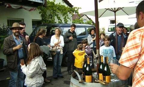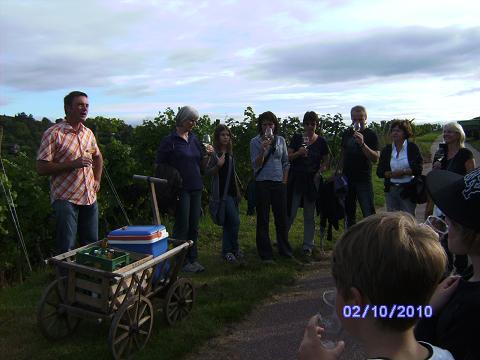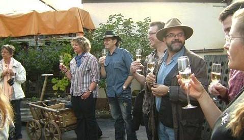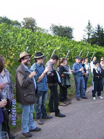 Weitgehend gemeinsam mit öffentlichen Verkehrsmitteln angereist, kamen die SängerInnen teilweise mit Familien schon gut gelaunt zum Begrüßungstrunk, einem Sciavasecco, am Weingut an. Der Wengerter Herr Warth köpfte die ersten Flaschen zur Einstimmung mit einem Langdolch aus der Zeit Napoleons. Steil aufwärts ging es dann in die Weinberge unterhalb des „Württemberg“ mit seiner bekannten Grabkapelle. Dort wurde neben einer Hand voll Trauben -frisch von den Reben gepflückt- der erste Weißwein verköstigt, bevor es wieder zurück zum Weingut der Familie Warth ging, um die Weinprobe fortzusetzen. Diese wurde klassisch mit insgesamt 8 Weinen von Weiß- und Trinkwein zu Rot und edlem Gewächs durchgeführt, von fachkundiger und kurzweiliger Erklärung der Besonderheiten der einzelnen Weine, sowie einem leckeren Essen begleitet.