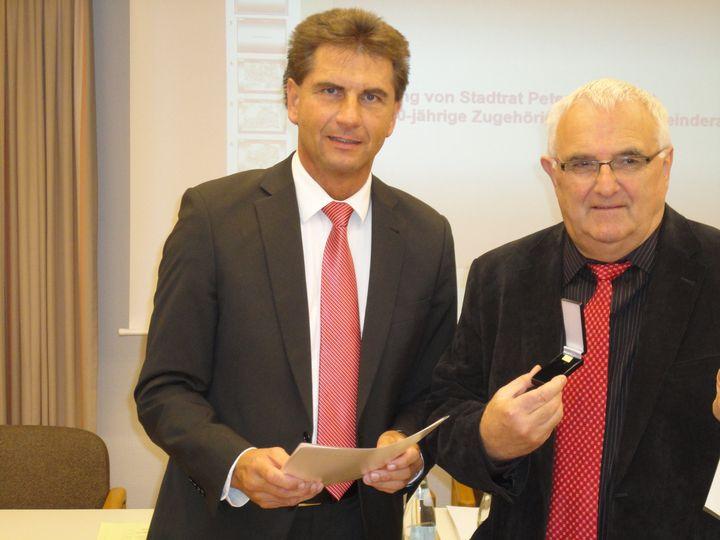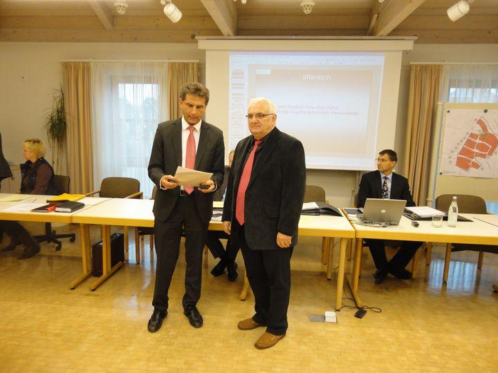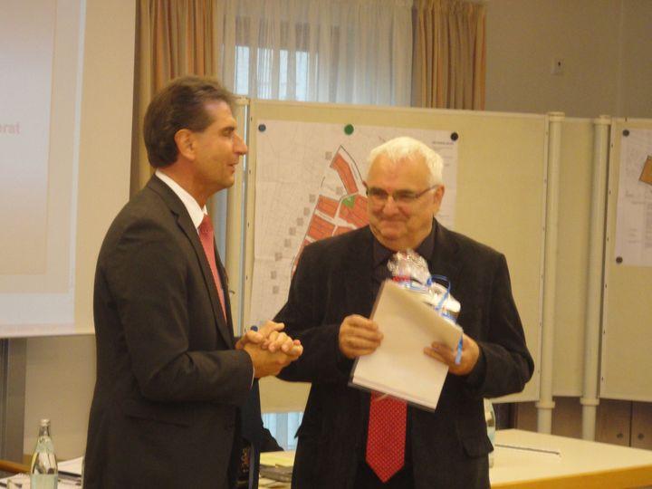 Stadtrat Peter Ritz wurde zu Beginn der gestrigen Gemeindratssitzung von Bürgermeister Klaus Heiniger für 30 Jahre Zugehörigkeit zum Eislinger Gemeinderat geehrt. In seiner Würdigung erinnerte der Bürgermeister an einige Eislinger Erungenschaften an denen der Geehrte mitgewirkt hatte: Bücherei im Schloss, Marstall, Stadthalle, Kreisel(kunst) , Einsatz für Altbürger und Migranten und und und. Als Zeichen der Anerkennung überreichte er ihm die goldene Plakette und eine Urkunde des Gemeinde- und des Städtetages. Angela Schirling, die stellvertretende SPD-Fraktionsvorsitzende, zeigte auf einem „Spaziergang“ durch Eislingen, was sich in den letzten 30 Jahren in Eislingen zum Positiven verändert hat. Peter Ritz hatte maßgeblichen Anteil daran. Sie erinnerte auch daran, wie er sich (erfolgreich) für eine von der Abschiebung bedrohte Familie eingesetzt hatte. Die Wähler machten in in mehreren Kommunalwahlen zum „Stimmenkönig“; seit Jahren bekleidet er das Amt des „1. Stellvertretenden ehrenamtlichen Bürgermeisters“. Sie würdigte die Persönlichkeit, die Hartnäckigkeit und die Ausauer das SPD-Fraktionsvorsitzenden. Sie versäumte es auch nicht aufzuzeigen, welchen Kränkungen und Verletzungen Peter Ritz in der Folge des Bürgermeisterwahlkampfes ausgesetzt war. Bürgermeister ehrt Peter Ritz |