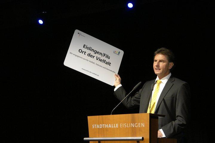 Im Rahmen des Wahlfestes zum Forum der Integration präsentierte Bürgermeister Heininger in der Stadthalle die Verleihungsurkunde zum Titel 'Ort der Vielfalt'. Dieser Titel wurde Eislingen am 21. Oktober 2010 von der Bundesregierung verliehen.