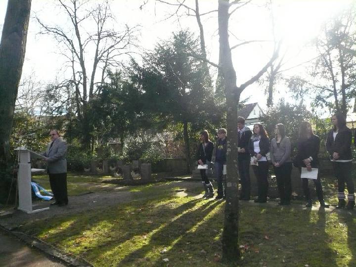 Diakon Siegfried Riedmüller unterstrich die Bedeutung der Totenehrung für den Einsatz für die Lebenden. Bürgermeister Klaus Heininger wies darauf hin, dass es wichtig sei, dass auch die junge Generation bei dem Gedenken dabei sei und SchülerInnen der Silcherschule trugen Texte zur Ehrung und zur Mahnung vor und umrahmten die Kranzniederlegung mit der Aufstellung von Grablichtern vor der Pieta der Gedenkstätte.