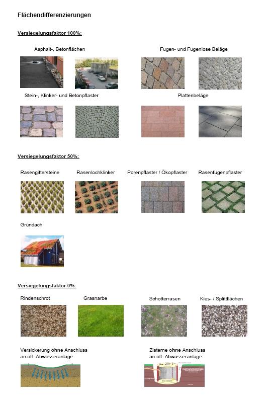 Für die Bemessung der Niederschlagsgebühr werden die versiegelten Flächen mit einem Faktor multipliziert, der unter Berücksichtigung des Grades der Wasserdurchlässigkeit für die einzelnen Versiegelungsarten wie folgt festgelegt wurde: