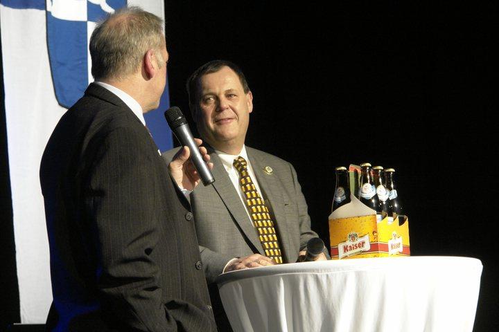 Den zweiten kulinarischen Höhepunkt stellte der erste Beigeordnete Fitterling zusammen mit dem Geislinger Brauer Kumpf von der Kaiserbrauerei vor. Das Eislinger Jubiläumsbier, ein Märzenbier, gebraut aus heimischer Braugerste, Aromahopfen aus Tettnag und vier Märzsorten (unter anderem Münchner Malz, karamelisiertem Malz). Diese geben diesem speziell für das Eislinger Jubiläums gebrauten Bier einen besonders würzigen Geschmack. Ab Montag wird dieses Bier im lokalen Einzelhandel in Eislingen erhältlich sein. Die Kaiserbrauerei hat zugesagt, daß für jeden verkauften Kasten Bier fünfzig Cent der Stadt Eislingen für einen sozialen Zweck zur Verfügung gestellt werden.
