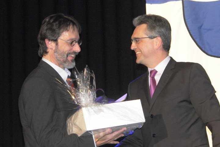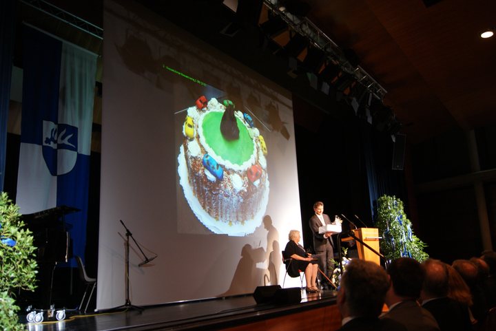Bürgermeister Heininger zauberte als Überraschung für die geehrten jeweils eine neu geschaffene Kreiseltorte als Geschenk auf die Bühne. Außerdem präsentierten der erste Beigeordnete Fitterling und Braumeister Kumpf das Eislinger Festbier 2011. (siehe unser separater Bericht)