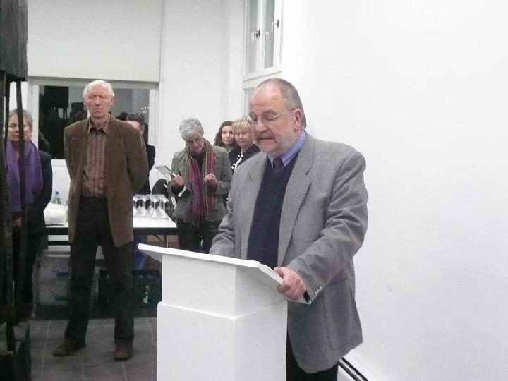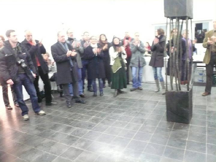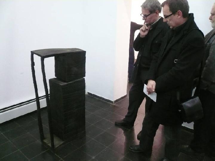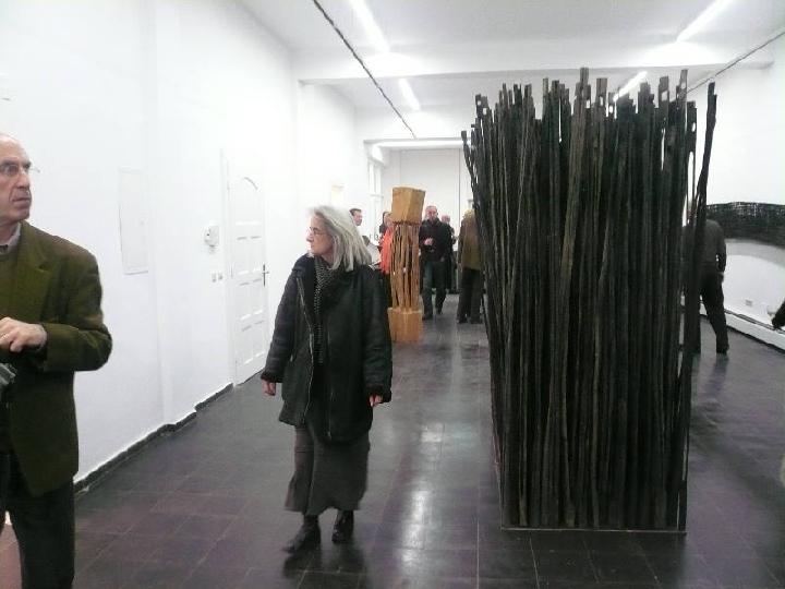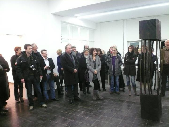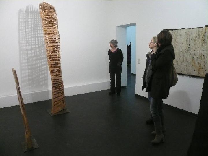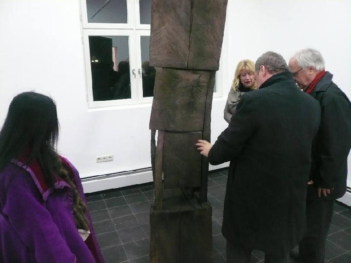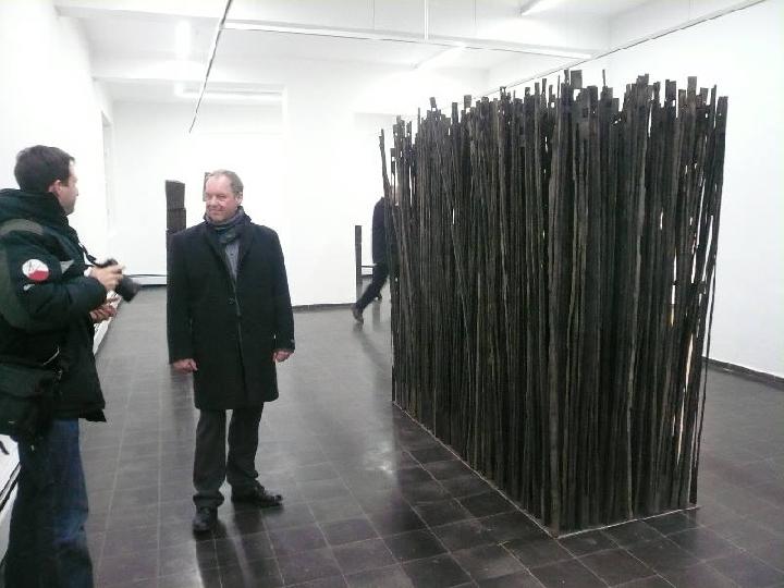 Trotz leichtem Schneetreiben war der Besuch in der Alten Post außergewöhnlich - der renommierte Holzbildhauer, Zeichner und Maler Armin Göhringer aus Zell am Harmersbach im Schwarzwald zog wie ein Magnet ein Publikum aus der Region an, der Vernissage-Redner Dieter Brunner von den Städtischen Museen Heilbronn zog ebenso Publikum an. Armin Göhringer vor der Skulptur aus 450 Stelen |