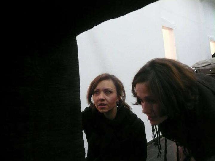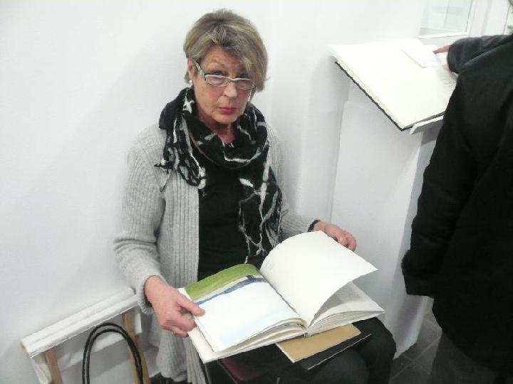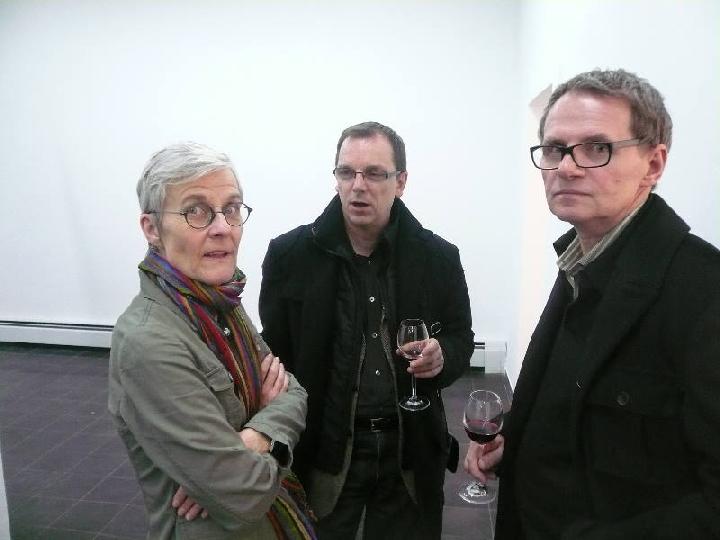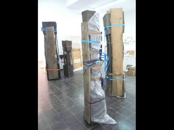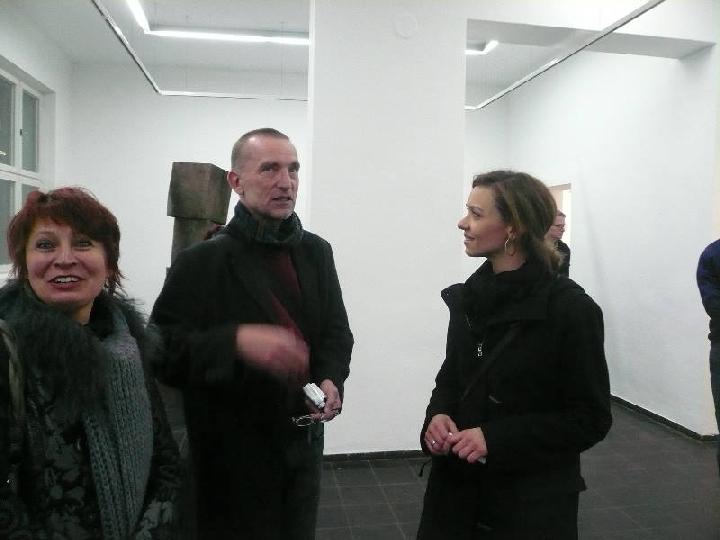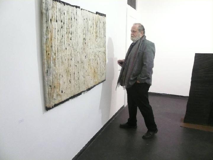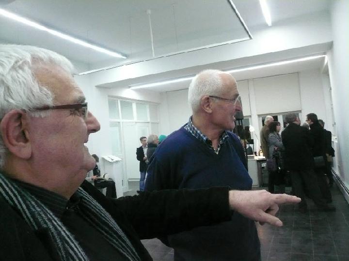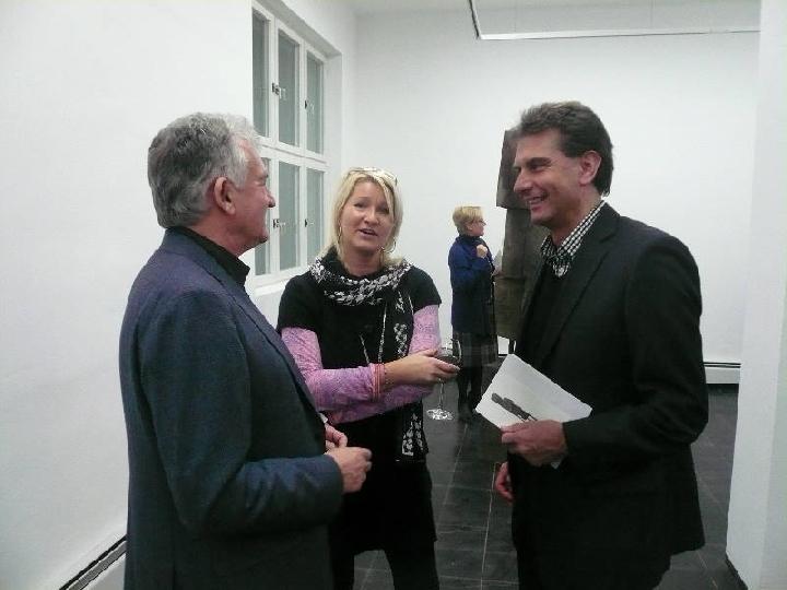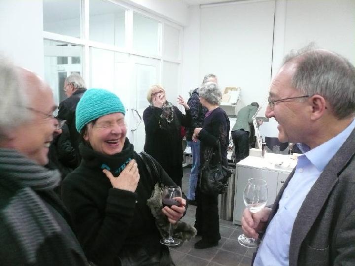 Trotz leichtem Schneetreiben war der Besuch in der Alten Post außergewöhnlich - der renommierte Holzbildhauer, Zeichner und Maler Armin Göhringer aus Zell am Harmersbach im Schwarzwald zog wie ein Magnet ein Publikum aus der Region an, der Vernissage-Redner Dieter Brunner von den Städtischen Museen Heilbronn zog ebenso Publikum an. Armin Göhringer vor der Skulptur aus 450 Stelen |