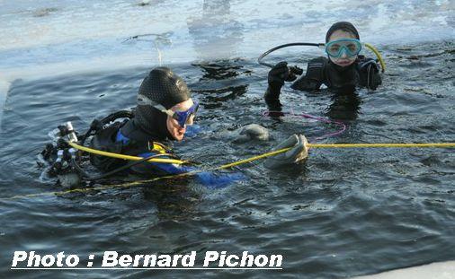 C'est par un Magnifique Beau temps que les Plongeurs Hollandais et Oyonnaxien sont tombés dans les eaux glaciale du Lac Genin, Beaucoup de monde pour cette première plongée avec une jeune Oyonnaxienne Sécile 15 ans qui faisait son Baptême de Plongée. Sécile, 15, bei der Eistauchpremiere im Lac Genin |