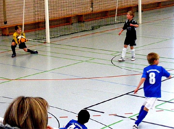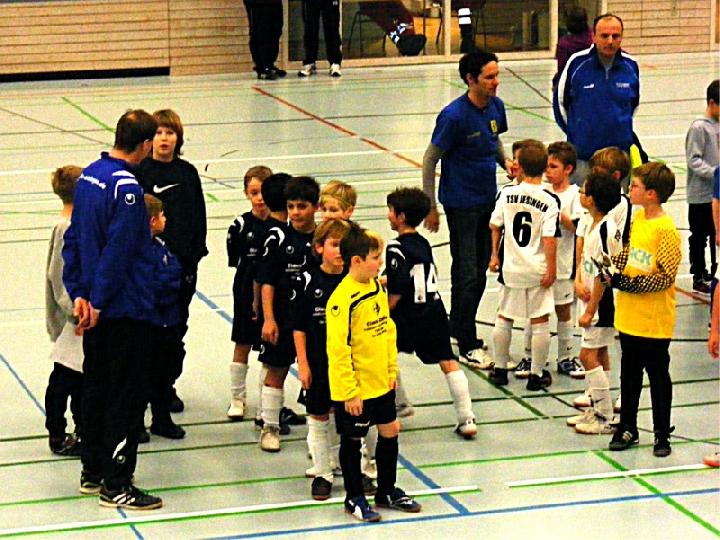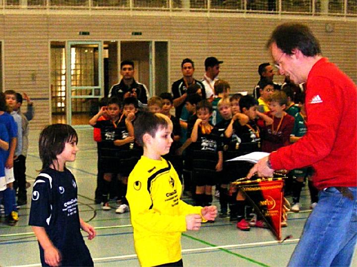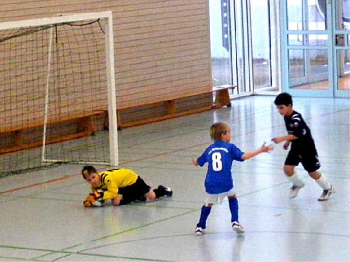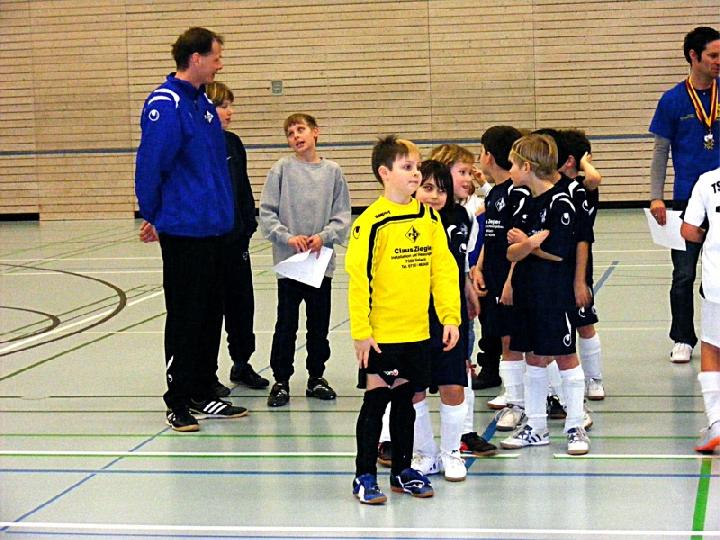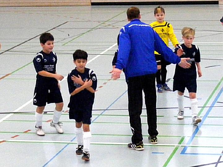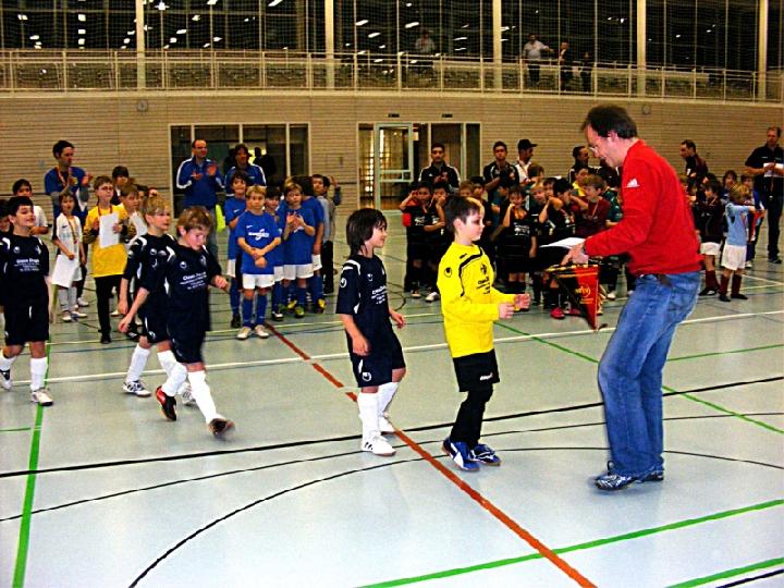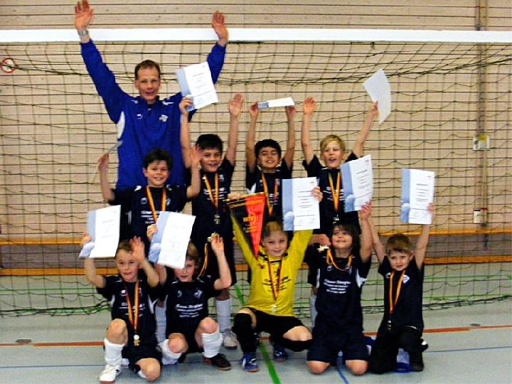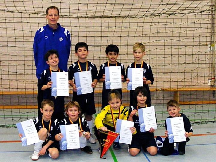 Die Auftaktbegegnung gegen den TSV Deizisau endete mit einem unbefriedigenden 1:1. Auch im nächsten Spiel gegen die Wernauer Sportfreunde mussten sich die Jungs mit einem 2:2 zufrieden geben. Diese Punktverluste fehlten am Ende in der Endabrechnung. Besser lief es dann gegen die starken Kicker des TSV Jesingen, denn die Abwehr hatte sich stabilisiert und musste auch in den weiteren Begegnungen kein Tor mehr hinnehmen. Endstand 1:0. Mit dem selben Ergebnis wurde der spätere Bezirksmeister TSV Wäldenbronn Esslingen bezwungen. Als auch der TSV Wendlingen beim 2:0 den Kürzeren zog, war das letzte Spiel gegen den Stadtrivalen KSG der Schlüssel zum Bezirksmeistertitel. Trotz größter Bemühungen reichte es nur zu einem, allerdings gerechten, torlosen Unentschieden. Im letzten Spiel des Tages reichte den Esslinger Vorstädtern ein 1:1 gegen die tapfer kämpfenden Jesinger um sich mit einem Punkt Vorsprung vor dem FCE den begehrten Titel zu sichern. hinten v.l.: Trainer Alexander Fitterling, Leon Melchior, Emir Musliu, Enrico Savarese, Paul Rupp, vorne: Nico Holzwarth, Daniel Schroweg, Maxim Graf, Liam-Marcel Meir, Yannick Fitterling |