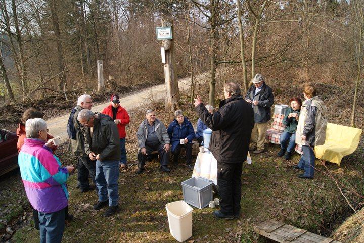 Wanderparkplatz unweit vom nördlichen Ortsende von Eschenbäche. Hierhin hatte Walter zu einer Pause Kaffee und Hefenkranz organisiert. Den Kaffee hatte Anni Dießenbacher zuvor zubereitet und zusammen mit Konrad zu dem Parkplatz gebracht und die Wanderer bewirtet. Walter hat dann noch über die Geschichte von Eschenbäche einen kleinen Bericht abgegeben. www.eislingenwiki.de.