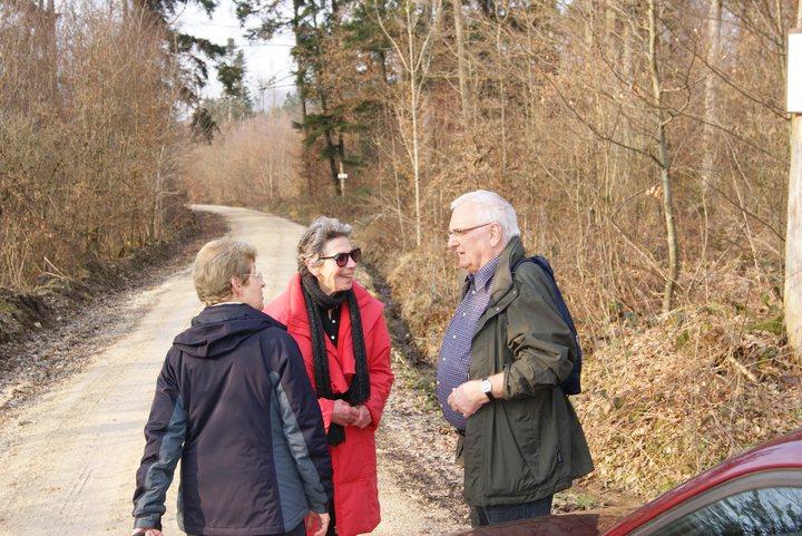 Frisch gestärkt und auch einem Schnäpschen von Martina im Bauch ging es wohlgemut weiter. Wir gingen durch Eschenbäche und mitten im Ort schwenkten wir nach rechts Richt. Westen in den Wald >Hochhalde< bis zur Kreuzung des Waldwegs von Hohenstaufen in nord-südlicher Richtung nach Eislingen führend. Hier hielten wir für ein Gruppenfoto