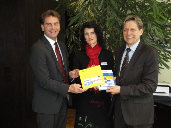 Dieter Becker überreicht BM Klaus Heininger und Heike Rapp von der Pressestelle, die den Textteil des Stadtporträts entworfen hat, die „Gelben Seiten“ und „Das Örtliche“.