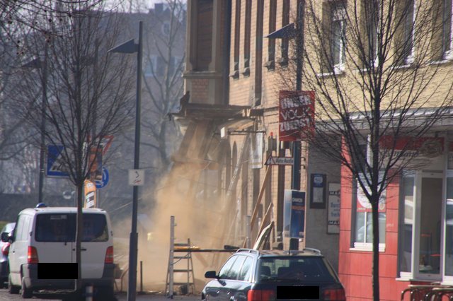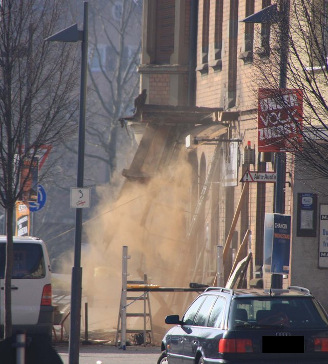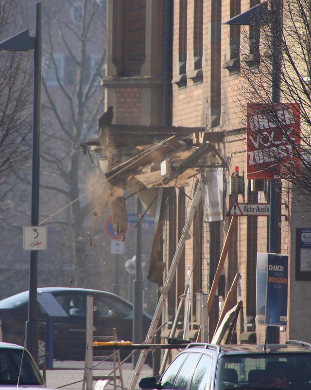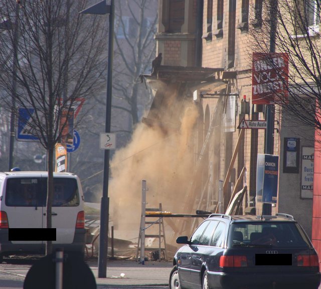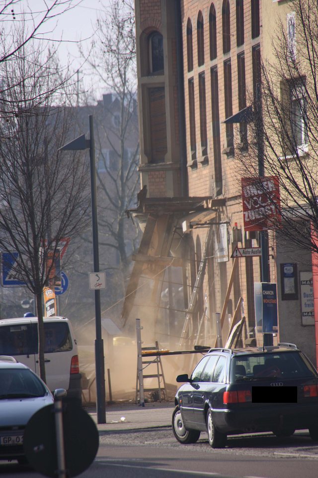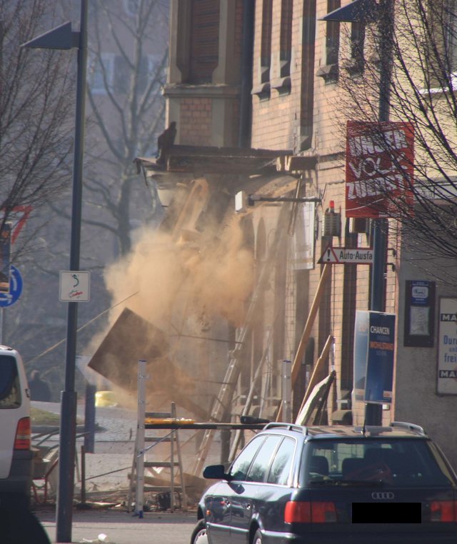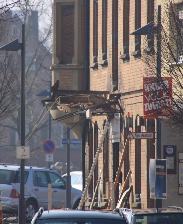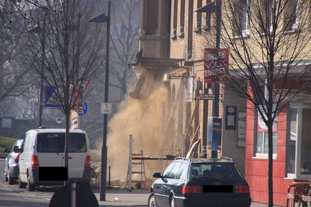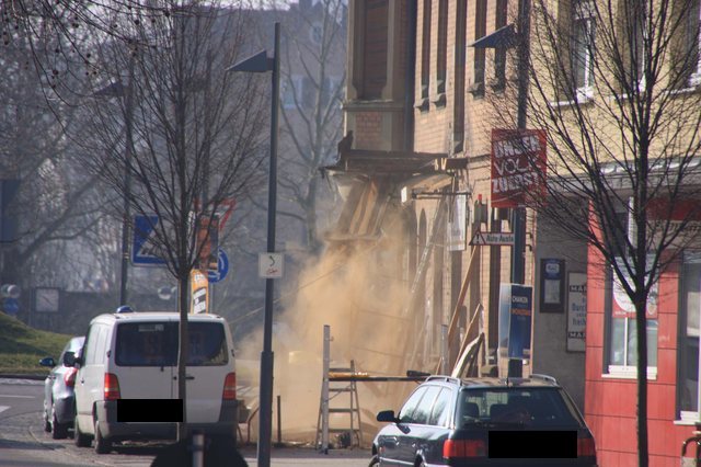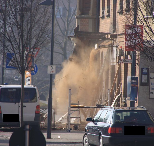 Der CDU Stadtverbandsvorsitzende war dank Wahlkampf vorort, als ein Kapitel Eislinger Geschichte in Schutt und Staub endete. Der Balkon über dem Adlereingang ist jetzt selbst Geschichte. |