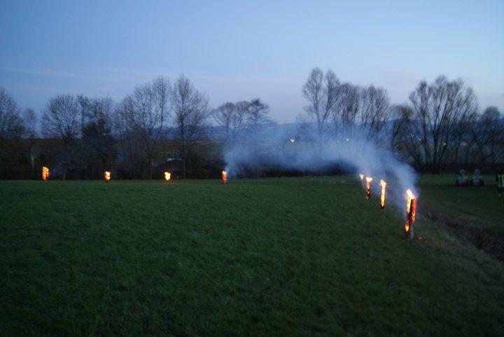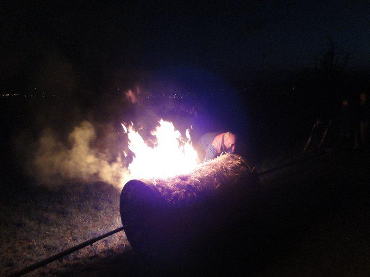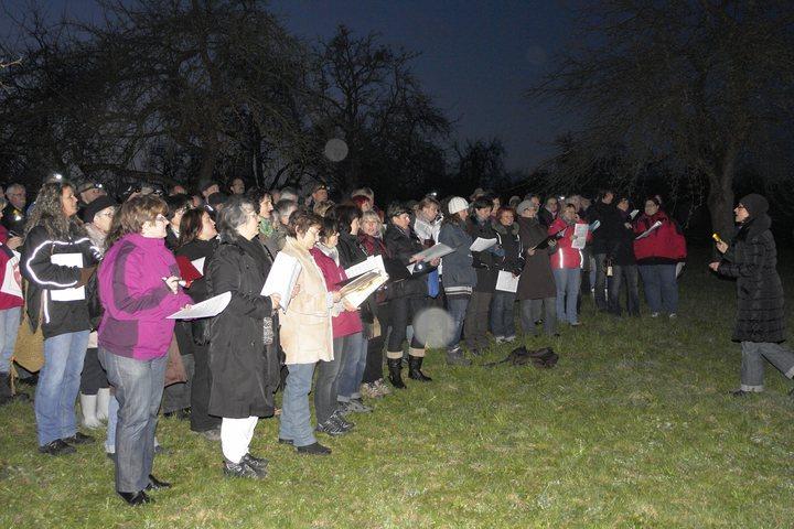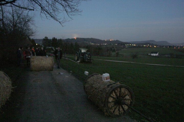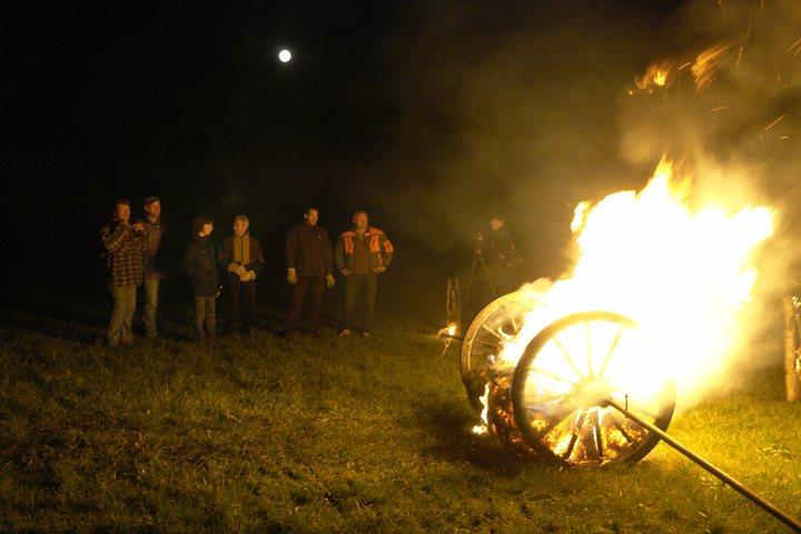 Unter der Regie von Thomas Faupel wird am 8. und 9.Juli in Eislingen die Carmina Burana unter Beteiligung von 300 Aktiven aufgeführt. Auf dieses Ereignis im Rahmen des Jubiläumsjahrs stimmten sich gestern die Chöre und ganz Eislingen ein. Der Obst- und Gartenbauverein Krummwälden unter Vorstand Hartmut Komm hat dazu den alten Brauch, zum Jahreszeitenwechsel Feuerräder ins Tal zu schicken, wieder ausgegraben. Die Eislinger Kulturamstleiterin Marie Luise Schäfer freute sich über den regen Zuspruch der Bevölkerung in dieser kalten Vollmondnacht. Insgesamt verfolgten 400 bis 500 Eislingerinnen und Eislinger dieses Ereignis. |