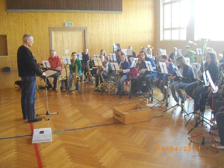 Am Samstag, den 16.04. machten sich 9 vor allem jugendliche Musiker des TSG-Musikzuges auf den Weg nach Backnang, um gemeinsam mit den Blasmusikern des Schwäbischen Turnerbundes für kommende Einsätze beim Gymfestival und dem Landesturnfest zu proben. Da der Probenbeginn auf 9.30 Uhr angesetzt war, musste man in den frühen Morgenstunden starten um pünktlich in Backnang-Steinbach zu sein. Unter der Leitung von Heinz Diemar wurden verschieden Musikstücke wie Märsche, Polkas und lateinamerikansiche Rhythmen ausprobiert. Gemeinsam mit weiteren 30 Musikern konnte man so ein stimmungs- und schwungvolles Musikprogramm auf die Beine stellen. Um 13.00 Uhr traten alle froh gelaunt den Heimweg an. Den teilnehmenden Musikern an dieser Stelle herzlichen Dank für ihr Engagement |