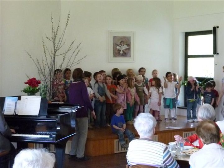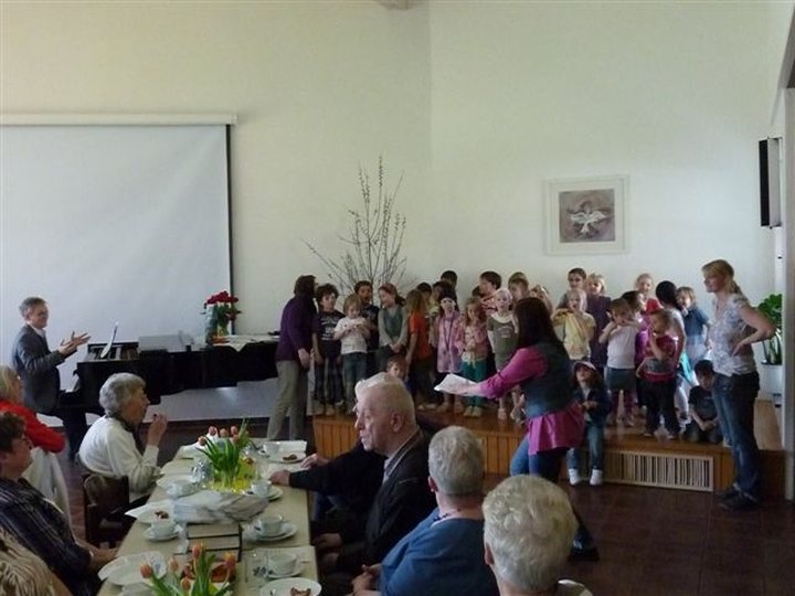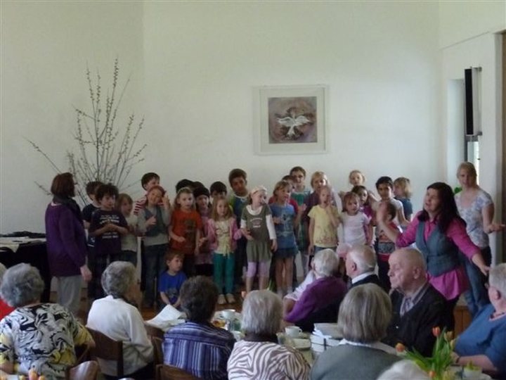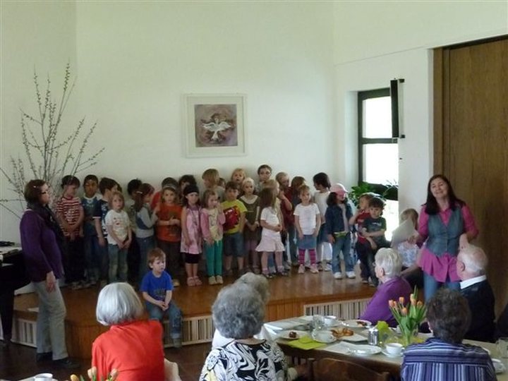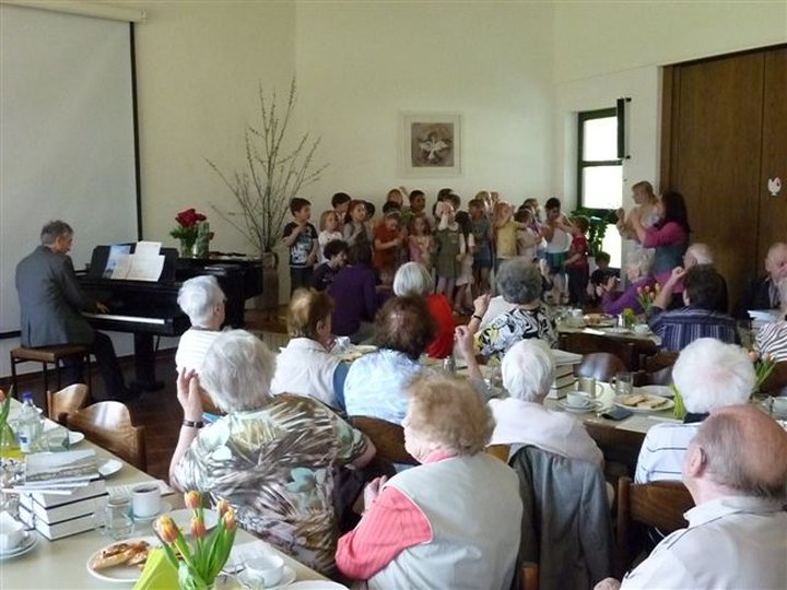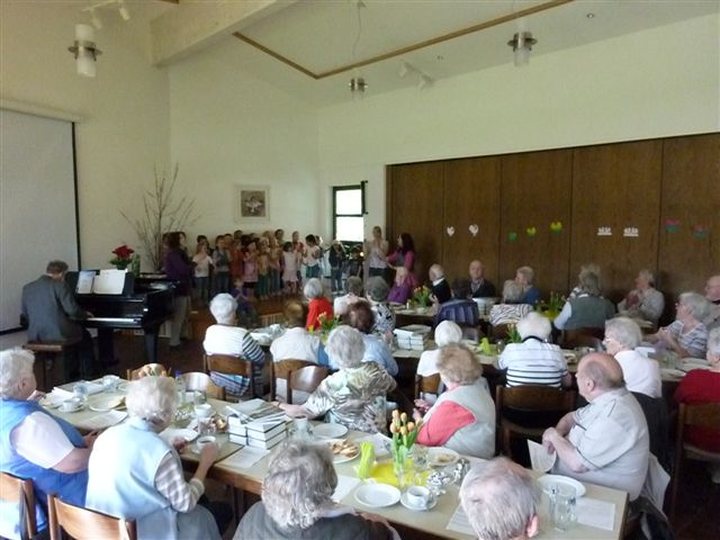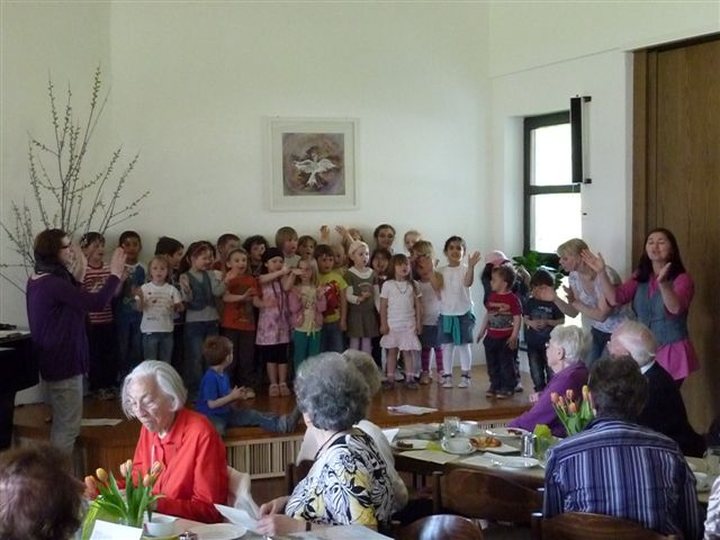 Es war eine große Gruppe von Kindergartenkinder, die in Begleitung von Erzieherinnen den Seniorennachmittag mit verschiedenen Bewegungsliedern die SeniorInnen erfreuten und gleichzeitig auch zum Mitmachen animierten. Begleitet wurden sie dabei von Pfr. Frieder Dehlinger am Flügel. Gemeinsames Singen ist nicht nur bei Senioren beliebt, sondern auch fester Bestandteil im Kindergartenalltag. So schuf gemeinsames Singen schnelle eine Nähe und Verbindung zwischen Kindern und SeniorInnen. Das Mitsingen wurde erleichtert, da die Lieder an bekannte Melodien anknüpften. Dass viele Ältere auch bei den Bewegungsliedern kräftig mitmachten, erfreute und stärkte die Kinder.