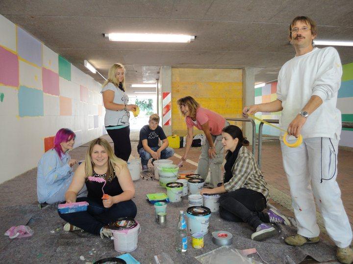 Die graphische Gestaltung der Rechtecke bereitet Werner Achatz vom Bauhof der Stadtverwaltung vor, so dass die Schüler mit zehn verschiedenen Farben die Wände zum Strahlen bringen. Ümit meint, „mit guter Vorbereitung ist das gar nicht so schwer. Im Unterricht wurden uns die Pläne und die Abklebetechnik gezeigt“, „und außerdem“, merkt Oliver an, „ gibt uns Herr Achatz vom Bauhof hier eine gute Anleitung“. Bürgermeister Klaus Heininger überzeugte sich vor Ort bei den jungen Eislingern von der phänomenalen Wandlung der bisher eher tristen Unterführung. „Ein gelungenes Gemeinschaftsprojekt für Eislingen, bei dem Gemeinderat, Stadtverwaltung, Schüler, Lehrer und Künstler von der Idee bis zur Umsetzung an einem Strang gezogen haben“, so das Stadtoberhaupt. “ Das gibt ein tolles Ergebnis“, lobte er die jungen Künstler, die mit handwerklichem Geschick die Farben in lockeren Pinselstrichen exakt und professionell an die Wände zaubern.“