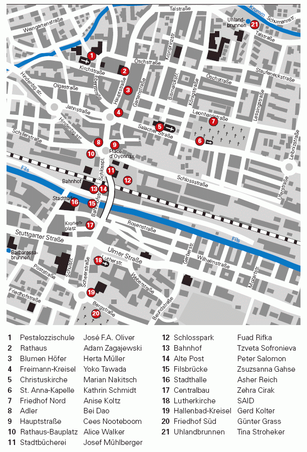 Zum Eislinger Jubiläumsjahr geht die Lyrik auf die Straße. Auf einundzwanzig Glasstelen werden die Menschen von verschiedensten Texten angesprochen. Große Namen wie Grass, Nooteboom, Walker, aber auch weniger bekannte Dichterinnen und Dichter haben einen Platz in Eislingens Straßen und Plätzen gefunden. Selbstverständlich fehlen auch die Eislinger Vertreter der Dichtkunst Tina Stroheker und Josef Mühlberger nicht.