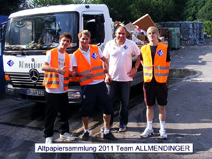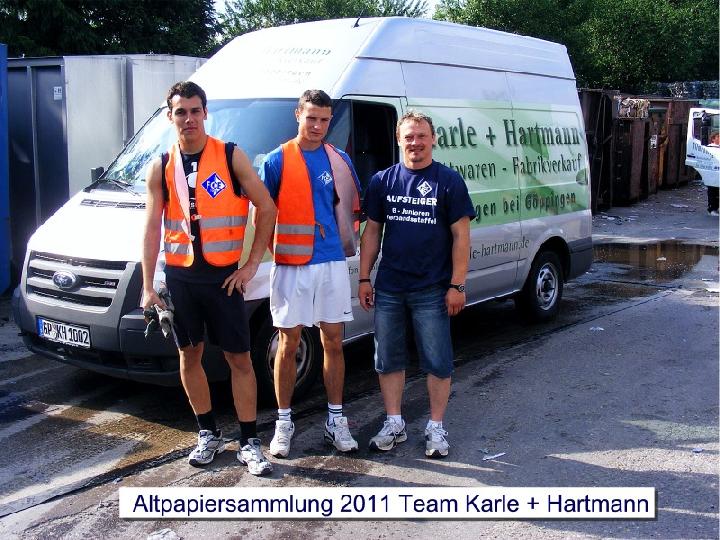 Wenn auch mit gut 53 to das Ergebnis des Vorjahres nicht erreicht wurde, ist man im Kreise des Fördervereins recht zufrieden, denn der Erlös der Sammelaktion wird als Grundlage für die Ausrüstung der 17 Jugendmannschaften, die ab September wieder in eine hoffentlich ähnlich erfolgreiche Saison gehen, dringend benötigt. Unser Dank gilt nicht nur der Eislinger Bevölkerung für die Bereitstellung des Sammelgutes, sondern auch den Unternehmen ALLMENDINGER-Gartenbau / Heiningen, HEIM - Bau- und Umwelttechnik / Salach, Maler-MERK / Eislingen, MOLL-Tief- und Straßenbau / Gruibingen, NÄGELE-Stahlbau / Eislingen, INTERTEX-Maschinenbau / Eislingen, KARLE & Hartmann / HEININGEN und KUTHE-Garten-und Landschaftsbau / Salach die Sammel-Fahrzeuge zur Verfügung stellten. |