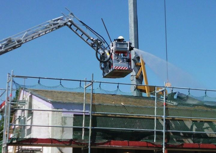 Der Dachstuhl eines Rohbaus fällt den Flammen zum Opfer