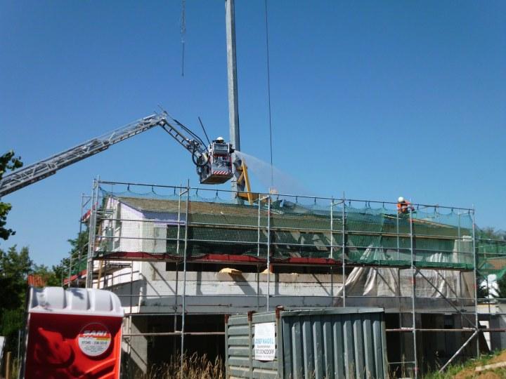 Das Wohnhaus war noch nicht fertig gestellt und das Dach noch nicht mit Dachziegeln bedeckt fiel der Dachstuhl den Flammen zum Opfer. Die Eislinger Feuerwehr war mit 3 Fahrzeugen und 15 Mann im Einsatz.