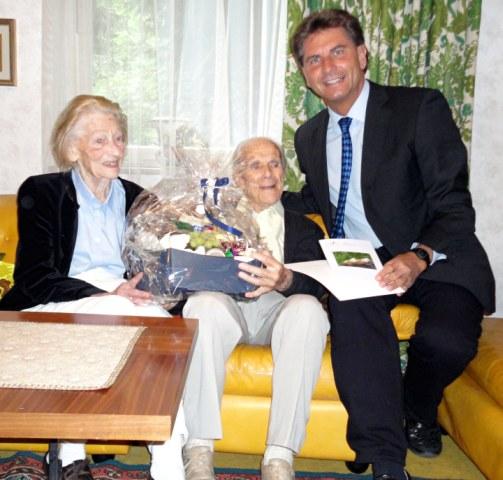 Dass dies in Eislingen gefeiert wird, ist für Bürgermeister Klaus Heininger eine kleine Besonderheit in seinem Amt als Stadtoberhaupt. „Geht man von einem Heiratsalter von 25 Jahren aus, müssen beide Ehepartner schon 100 Jahre alt werden und das ist wirklich ganz selten“, ist sich der Schultes sicher und gratulierte heute dem jung gebliebenen Ehepaar Margarete und Hermann Schmid ganz herzlich. Margarete und Hermann Schmid freuen sich über die Glückwünsche von Bürgermeister Klaus Heininger |