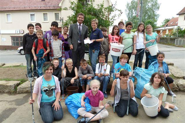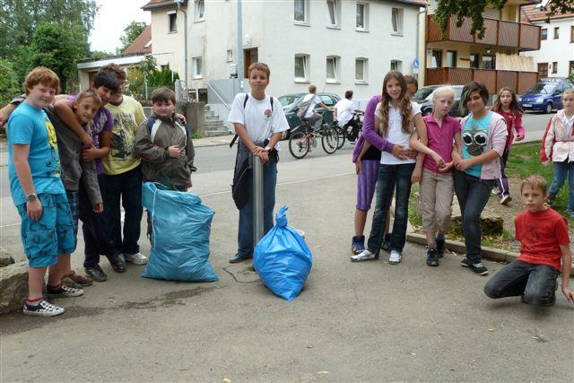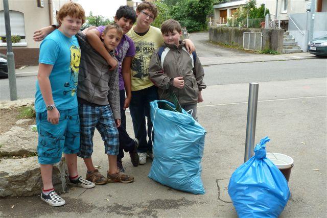 Drei Stunden lang zogen wir in kleinen Gruppen durch Eislingen und wunderten uns, was die Leute so alles „einfach fallen lassen“ – obwohl doch Abfallkörbe manchmal direkt daneben stehen! Am Schluss waren unsere blauen Säcke prall gefüllt. Herr Bürgermeister Heininger lobte uns und überbrachte uns 100 Euro als Anerkennung für unsere Arbeit, die wir natürlich an die „Aktion Ehrensache“ weitergeben.
