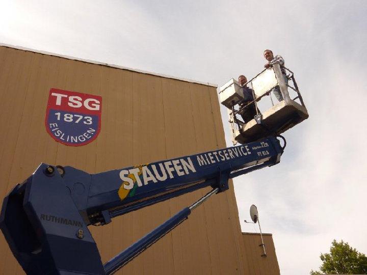 Leichter fiel da schon die Anbringung des TSG Schildes an der Außenwand des TSG Vereinszentrums.