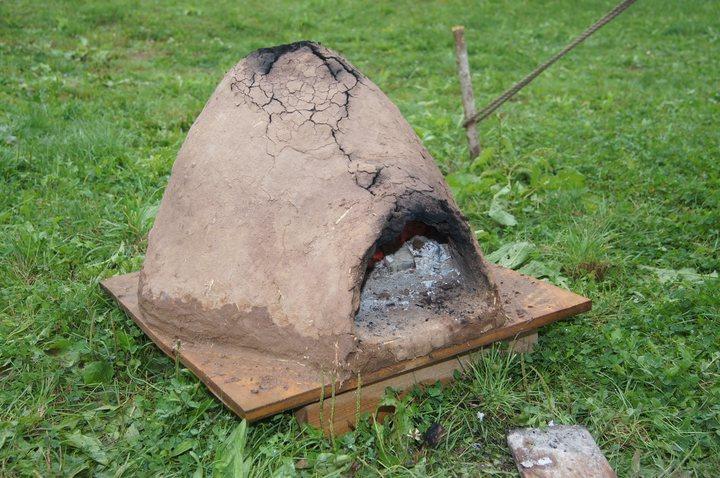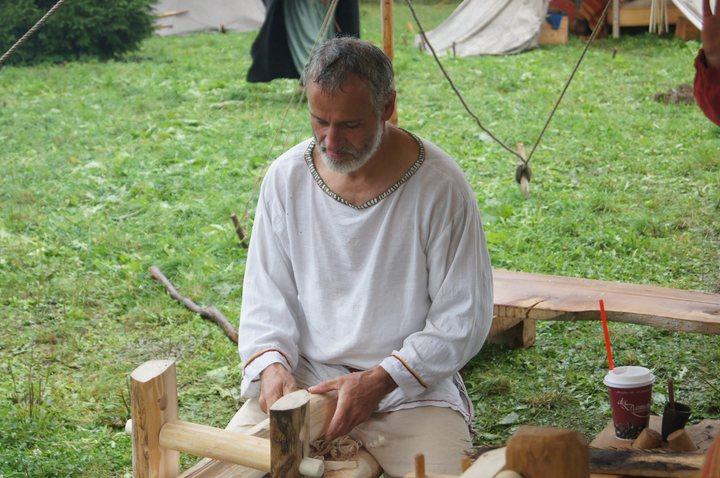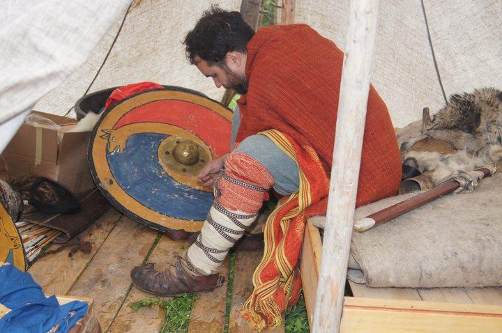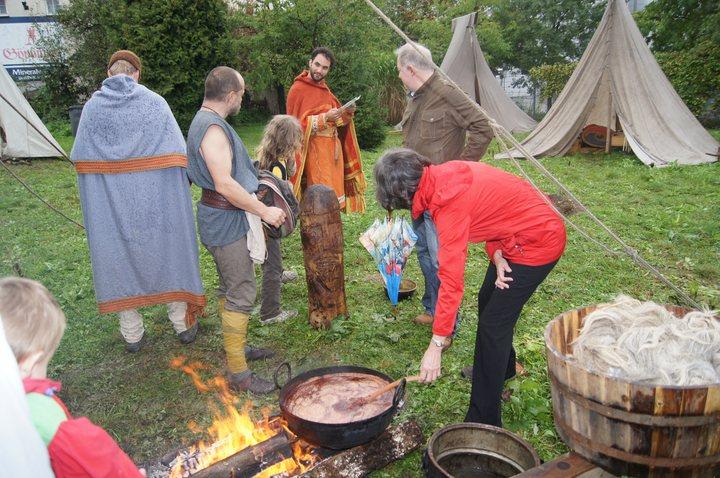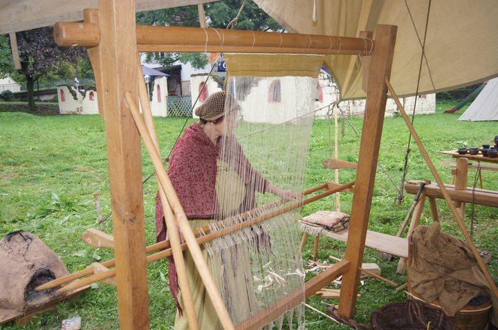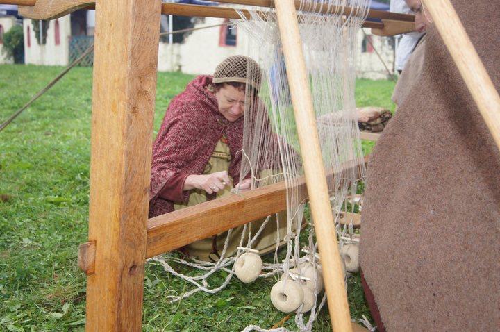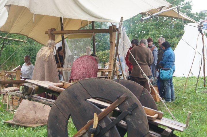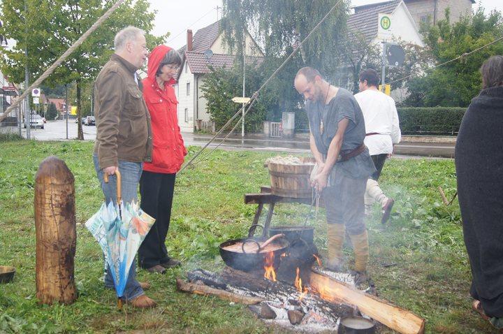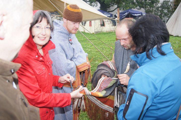 Pünktlich um 11:00 wurde in historischen Gewanden gewerkelt, gewebt und gefärbt. So mancher Besucher konnte sich unschwer in unsere Vorfahren versetzen, die bei einem solchen Wetter in Ledersandale durch aufgeweichte Wiesen wateten. Wie uns ein Mitglied der Gruppe verriet, waren diejenigen Vorfahren gut dran, die einen Schuh aus römischer Fertigung mit genagelter Sohle besaßen.