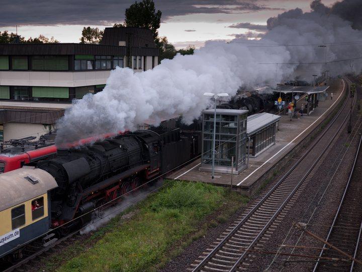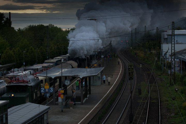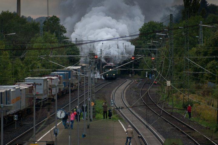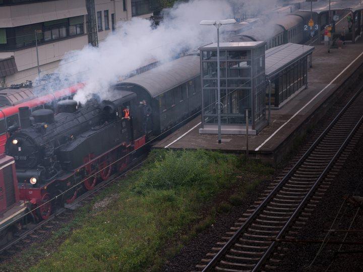 Stunde Verspaetung durchfuhr der Zug mit veieln historischen Lokomotiven und Wagen Eislingen. Entlang der Strecke und und auf der Eiuslinger Ueberfuehrungsbruecke hatten sich trotz des schlechten Wetters ettliche Trainspotter eingefunden. Das Eindrucksvolle Schauspiel war in wenigen Sekunden vorbei