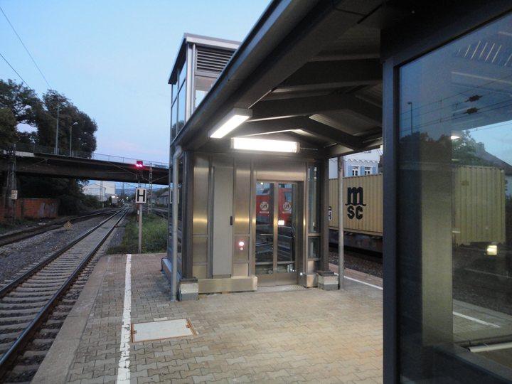 Augenscheinlich meint frau/man bei Durchquerung der umgebauten Bahnhofsunterführung, der Einbauarbeiten am Aufzug auf Gleis 2/3 des Eislinger Bahnhofs dürften beendet sein. Hell erleuchtet erwartet der gläserne Aufzugskorb auf Gäste. Doch sowohl am Bahnsteig als auch in der Unterführung steht das Zustiegssymbol auf rot. |