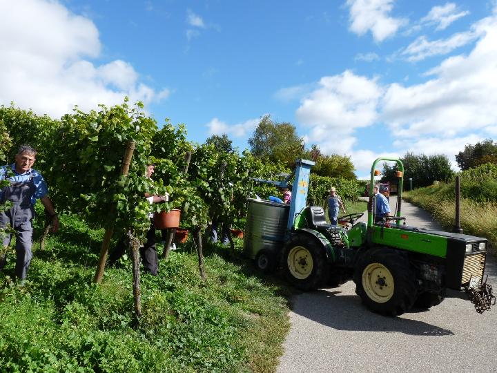 Am Samstag wurde unsere Gruppe noch durch eine frühere Eislingerin verstärkt. Sie ist der Liebe wegen in diese Gegend gezogen. Gemeinsam machten wir uns auf den Weg über Auggen und Schliengen nach Bad Bellingen. Das Wetter war ideal um durch die Weinberge zu wandern. Die Winzer waren überall an der Arbeit um die Früchte in die Kelter zu bekommen. Viele fleißige Hände sind nötig um die schönen Trauben einzusammeln. Wenn man dagegen den Erntemaschinen zuschaut, wie sie mit ihren Bürsten die Beeren abschlagen und einsaugen, findet man das irgendwie brutal und unpassend in dieser Landschaft.