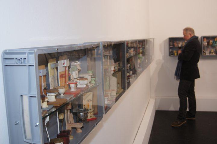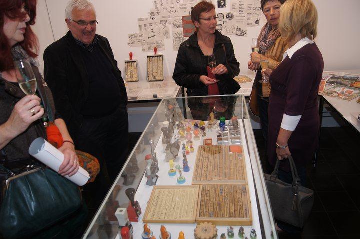 In den weiteren Kabinetten der alten Post geht es farblich gesehen, dann doch etwas ruhiger zu. Paul Kottmann stellt die Schallplattensammlung (LP) von James Petzina vor. Stempel in Hülle und Fülle zeigt Peter Ritz und Roland Schmitt stellt eine Auswahl seiner Puppenclos aus.